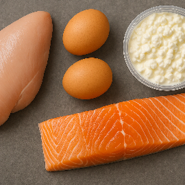 Proteína: frango, ovos, peixe e laticínios são quase consenso — renovam fibras e facilitam a reconstrução muscular.
