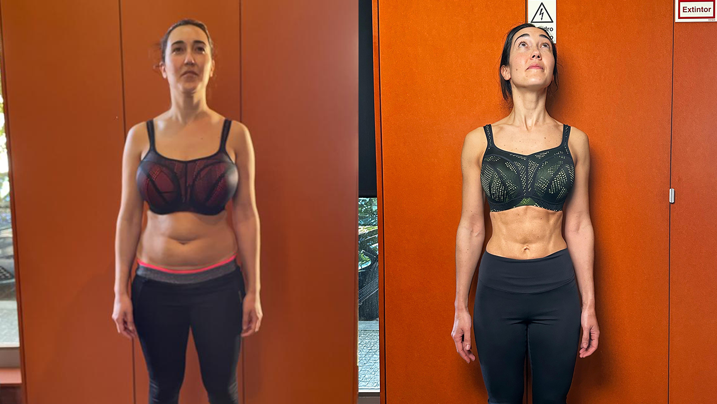 Dos 64,5 kg e 34% de massa gorda para 53 kg e cerca de 22% — uma transformação marcada por consistência, foco e equilíbrio.