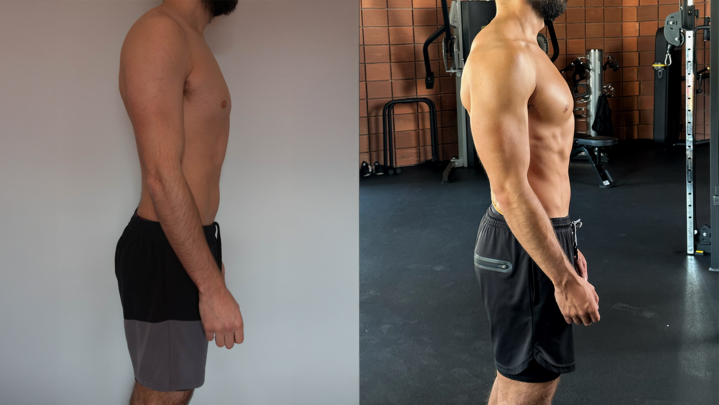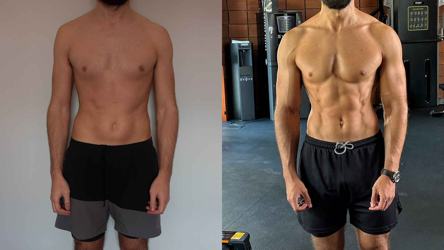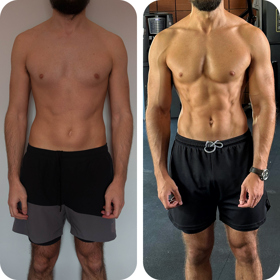 De 18% para 10% de massa gorda e mais 7,5 kg de peso — uma transformação que traduz um notável ganho de massa muscular e uma evolução física equilibrada, alcançada com consistência, disciplina e acompanhamento técnico personalizado.