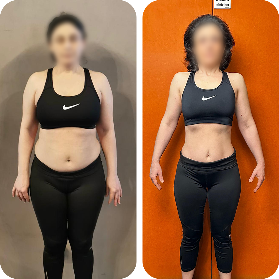 Dos 68,3 kg para 57,4 kg — uma transformação poderosa, construída no pós-parto do segundo filho e movida por determinação, consistência e força mental.