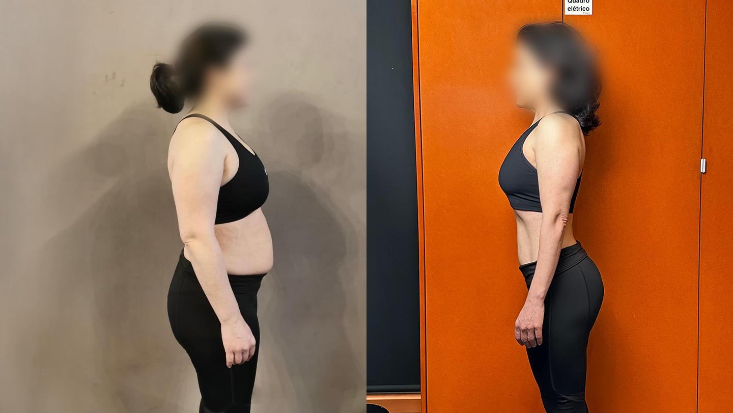Sessão após sessão, foi ganhando força, técnica e consciência corporal, especialmente na zona abdominal — que era o seu maior foco inicial.
